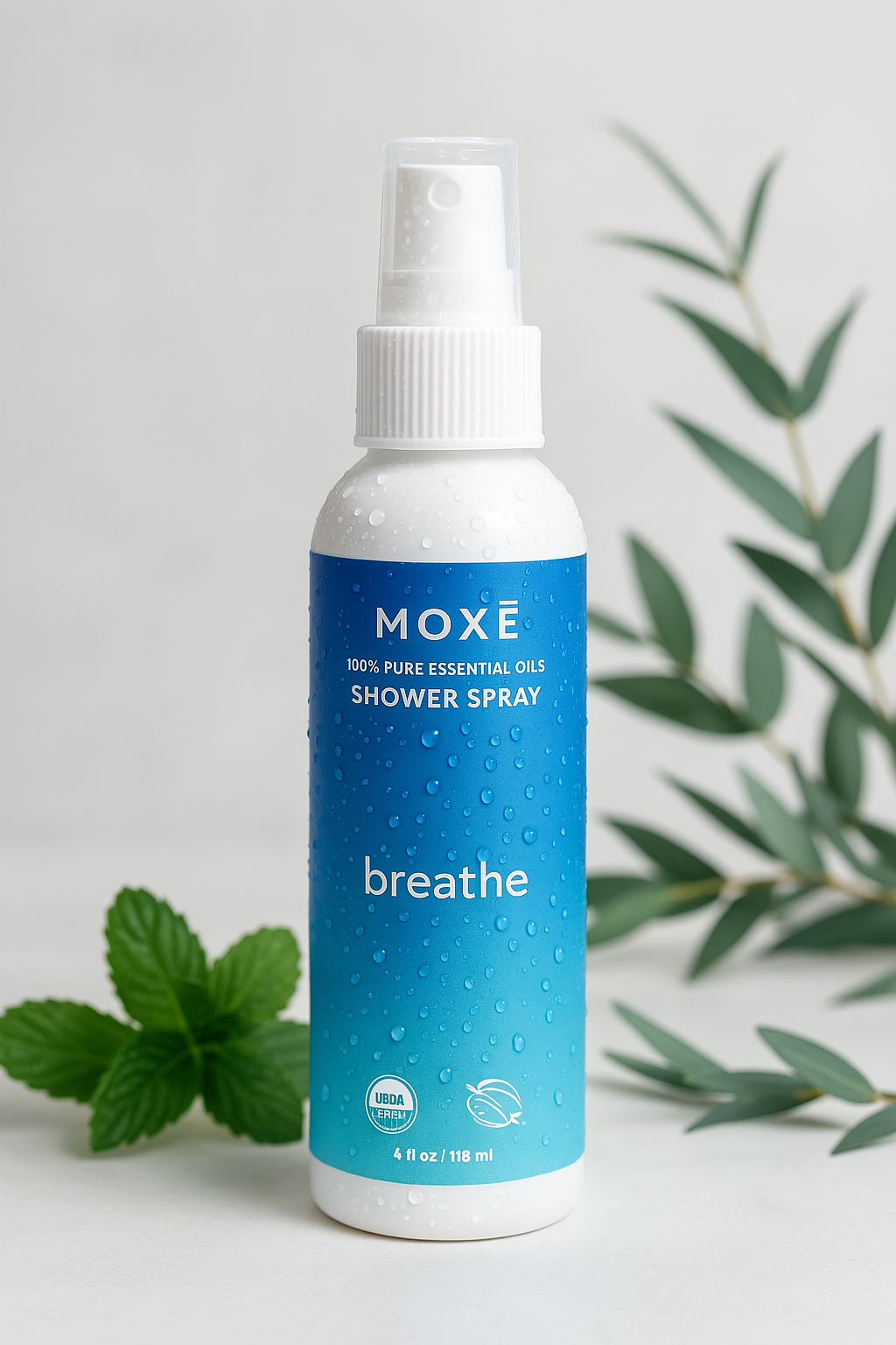 - Transform your shower experience with the power of eucalyptus and peppermint oil. Our 100% natural and organic Breathe aromatherapy shower spray is designed to invigorate your senses and uplift your mood every time you step into the shower. The refreshing and revitalizing scent of Breathe helps to ease the mind, clear congestion, and soothe tired muscles, leaving you feeling refreshed and energized.